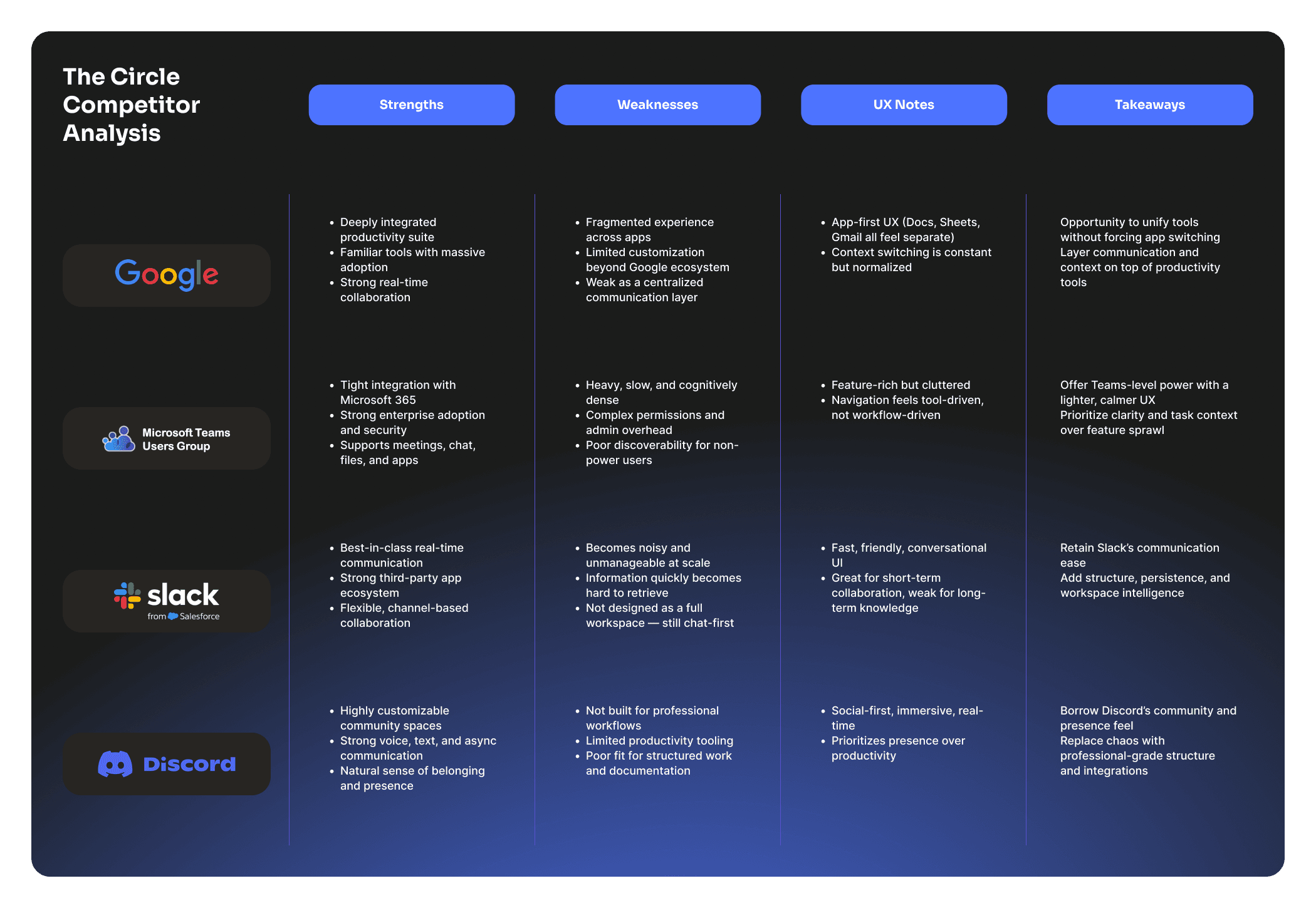 Conducted competitor analysis across direct and indirect communication tools to identify strengths and gaps